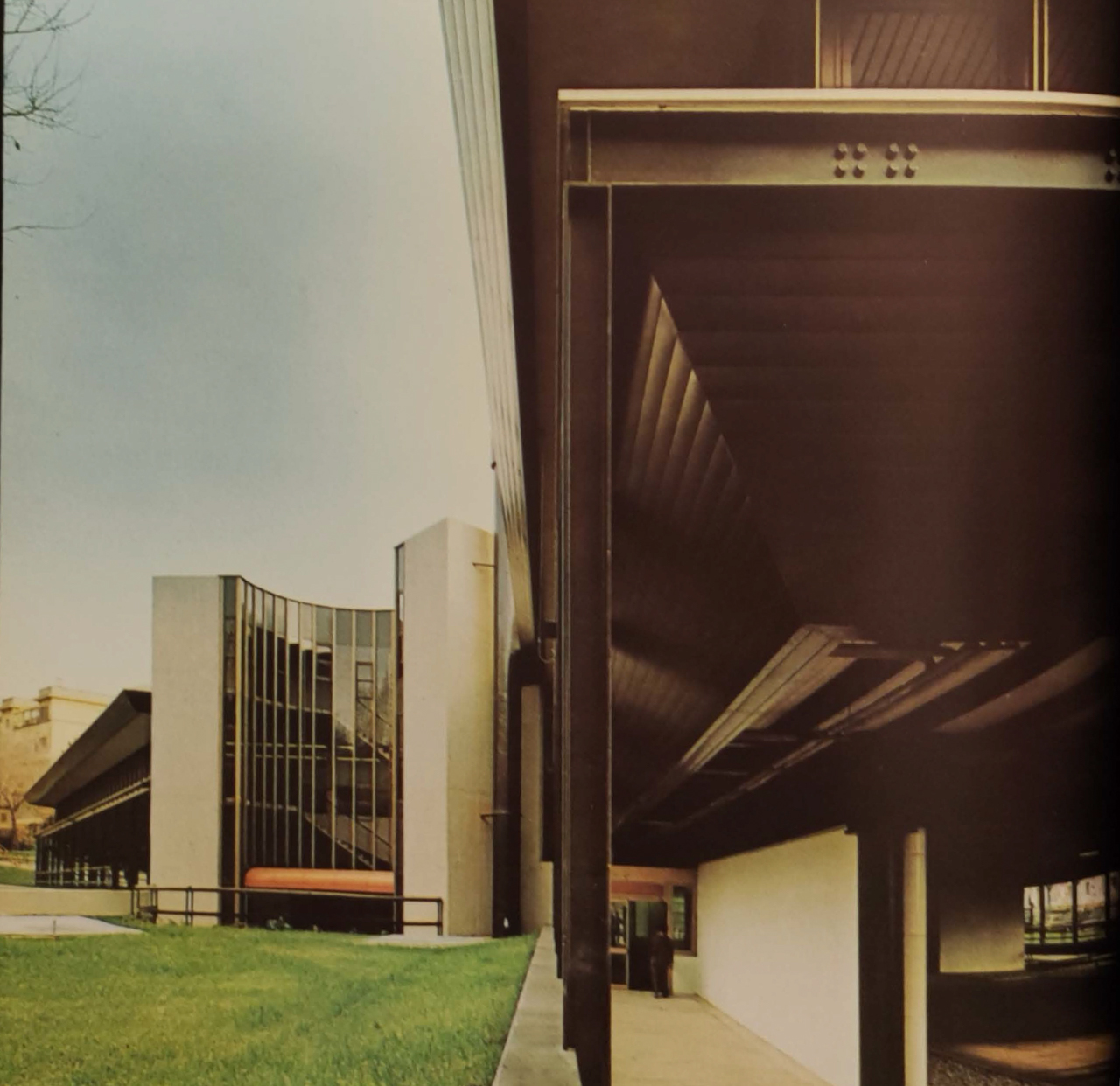 Struttura portante in acciaio e facciata continua. La struttura è realizzata in elementi metallici IPE, a telaio continuo, il cui corrente costituisce direttamente appoggio alla soglia delle finestre, sostiene e raccorda le travi a ginocchio ad interasse modulare del solaio di calpestio che portano anche, a mezzo di ritti tubolari corrispondenti ai montanti degli infissi, la soletta di copertura