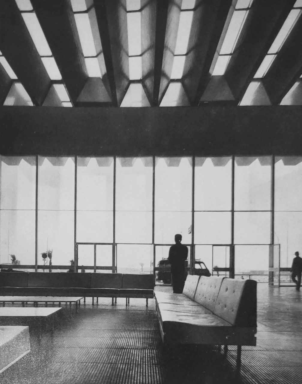 L’edificio, articolato su 3 livelli, si caratterizza per una grande hall centrale che contiene tutti i servizi necessari dell’aeroporto, dai controlli doganali agli uffici delle compagnie aree, e di un lungo molo di 600 m, tangente il corpo principale, dove si incrociano i transiti di arrivi e partenze.