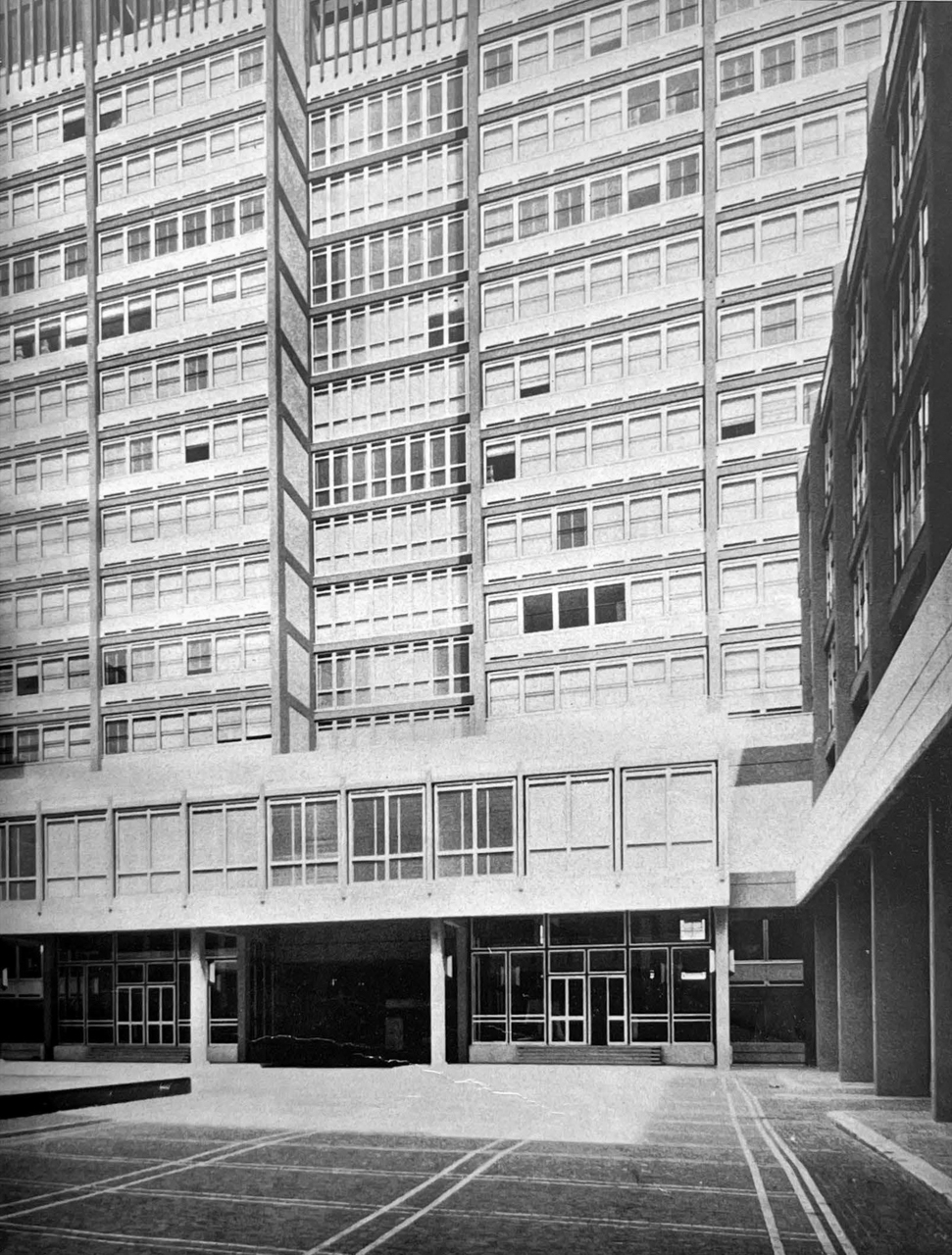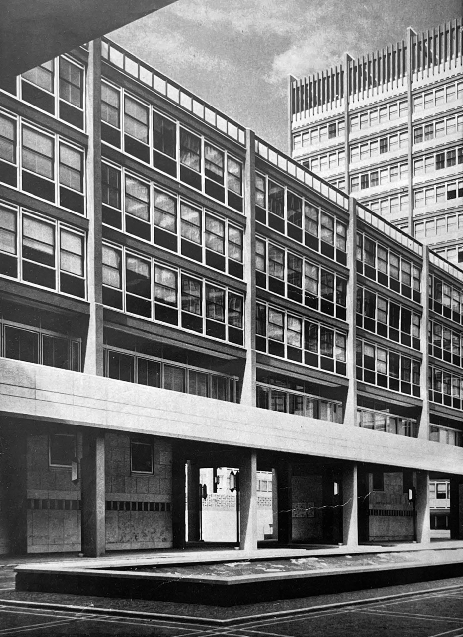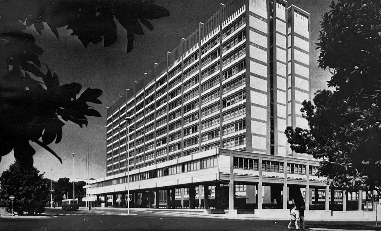 L’edificio rappresenta l’ampliamento dell’esedra dell’INPS, realizzata dagli stessi progettisti circa 20 anni prima. Il nuovo organismo si aggiunge all'esistente rispettandone l'asse fondamentale ed alcune indicazioni di colore e materiale, oltre che la modulazione delle strutture portanti