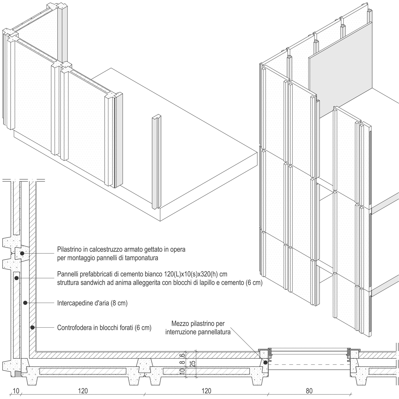 La struttura a telaio è di calcestruzzo armato gettato in opera. I tamponamenti, in larga parte prefabbricati, sono pannelli sandwich di cemento bianco, larghi 80-120 cm e alti 320 cm. La parete è completata in opera con una controfodera di laterizio. Il pannello ha un’anima alleggerita con blocchi di lapillo e cemento (s=6 cm) disposta tra due strati di calcestruzzo. I componenti sono posti in opera mediante il getto di pilastrini di collegamento in calcestruzzo armato.
