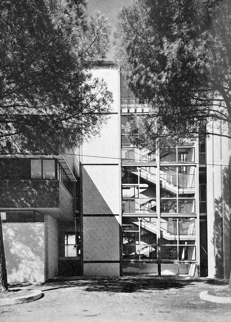 Complesso industriale di due edifici connessi da un corpo scala. La struttura, perimetrale, è in cemento armato; sono presenti inserti di prefabbricazione leggera nell’elemento della torre ingresso/scale (dove anche la struttura portante è in acciaio) e nelle facciate