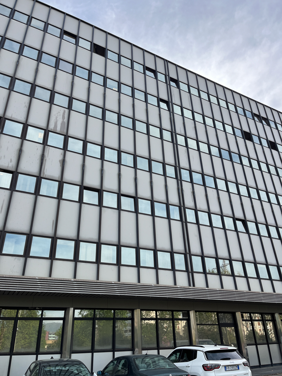 La struttura di acciaio è organizzata su una maglia strutturale a modulo rettangolare. L’intelaiatura del curtain wall consiste di montanti e di traversi di alluminio a taglio termico ancorati ai solai. I pannelli hanno telaio di alluminio e doppio vetro. I moduli opachi del curtain wall sono composti di pannelli sandwich di lamiera di alluminio e interposta resina poliuretanica. Il solaio è formato di travi IPE 270 con sovrastante soletta di calcestruzzo gettata sulla lamiera grecata.