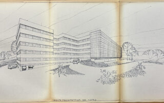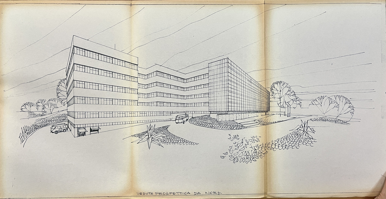 Il blocco che oggi ospita, tra l’altro, il pronto soccorso, fa parte dell’intervento di ampliamento del nucleo originario. L’ampliamento ha portato alla eliminazione del loggiato perimetrale e all’inserimento di un volume a sbalzo, profondo 120 cm, racchiuso, sui fronti NE, NO e SO, dal curtain wall vetrato ancora esistente.