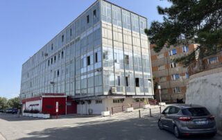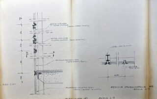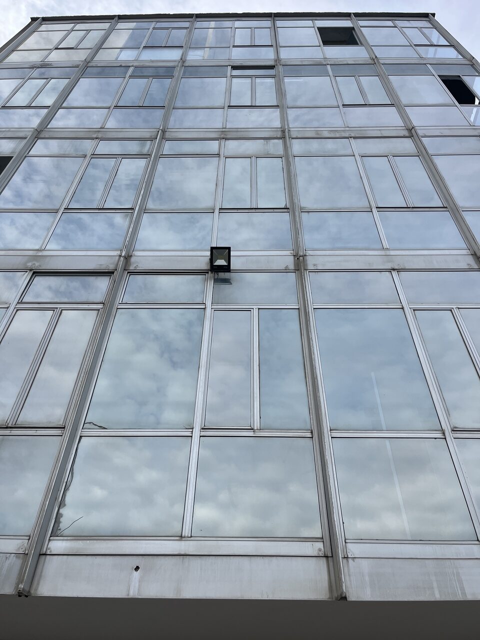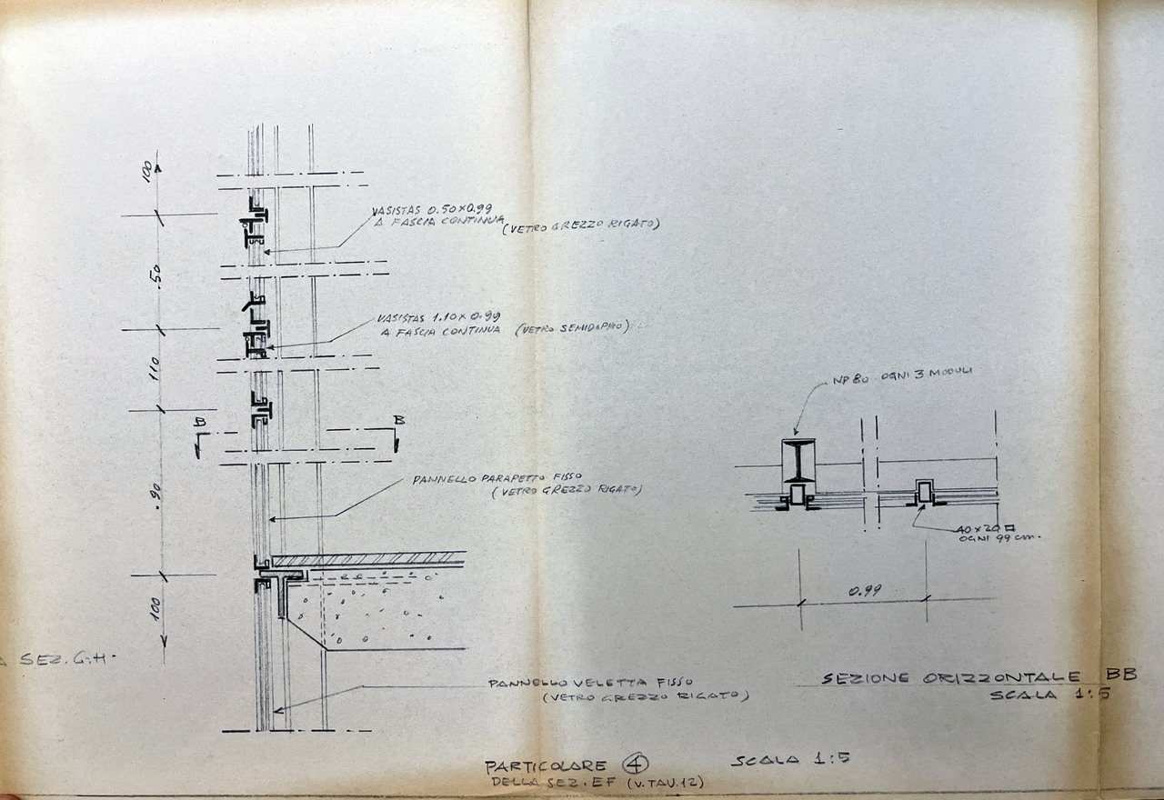 La struttura del blocco esistente è in calcestruzzo armato e gettata in opera. Il curtain wall è costituito di un’intelaiatura in acciaio smaltato, organizzata su base modulare cm 80x110. Ogni campo è suddiviso in tre moduli, uno fisso che funge da parapetto, uno mediano – in alcuni casi apribile – e uno soprafinestra a vasistas. I montanti in acciaio, disposti con passo di circa 160 cm, sono ancorati alle solette di calcestruzzo.