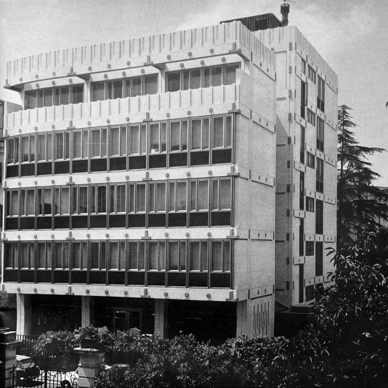 L’edificio copre in elevazione solo 480 mq a fronte dei 1450 del lotto. Estendendo nel sottosuolo alcune funzioni, come la sala delle assemblee e delle riunioni (250 posti), un bar, l'archivio, la biblioteca ecc. è stato infatti possibile liberare superficie per le rimanenti necessità, pur mantenendo compatta la volumetria. Grazie a sfalsamenti altimetrici nel giardino, tutti gli ambienti sotterranei possono comunque usufruire di sufficiente illuminazione e ventilazione naturale. La costruzione in cemento armato presenta, nei prospetti, un rivestimento particolarmente curato di lastre e masselli di marmo bianco di Carrara sorretti da sporgenze ricavate nel getto del cemento. Gli infissi sono in alluminio con fondi in “Petralit” nero. Nel prospetto sud e in quello ovest, brise-soleil metallici riparano dall'eccessivo irraggiamento.