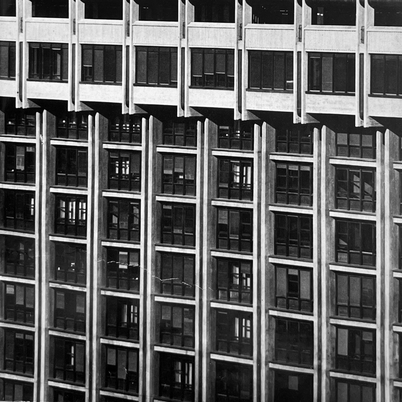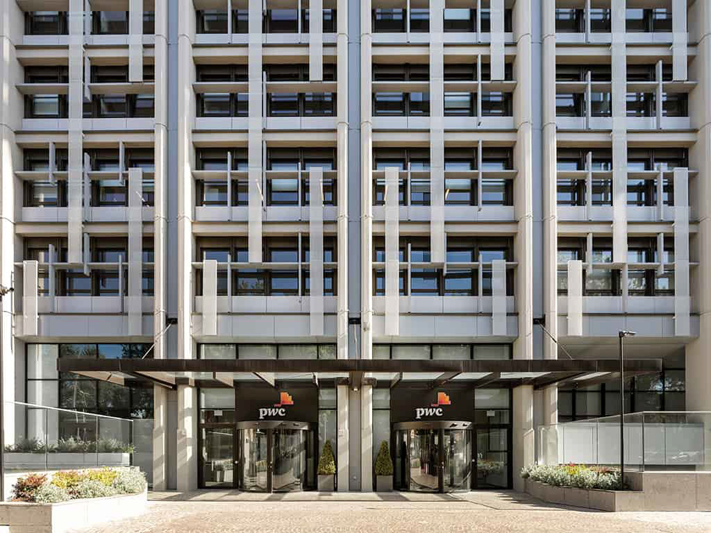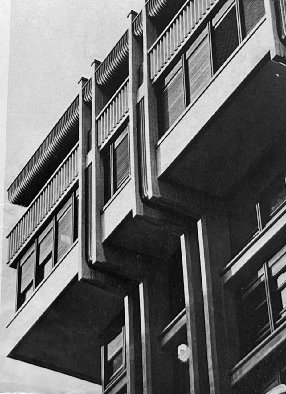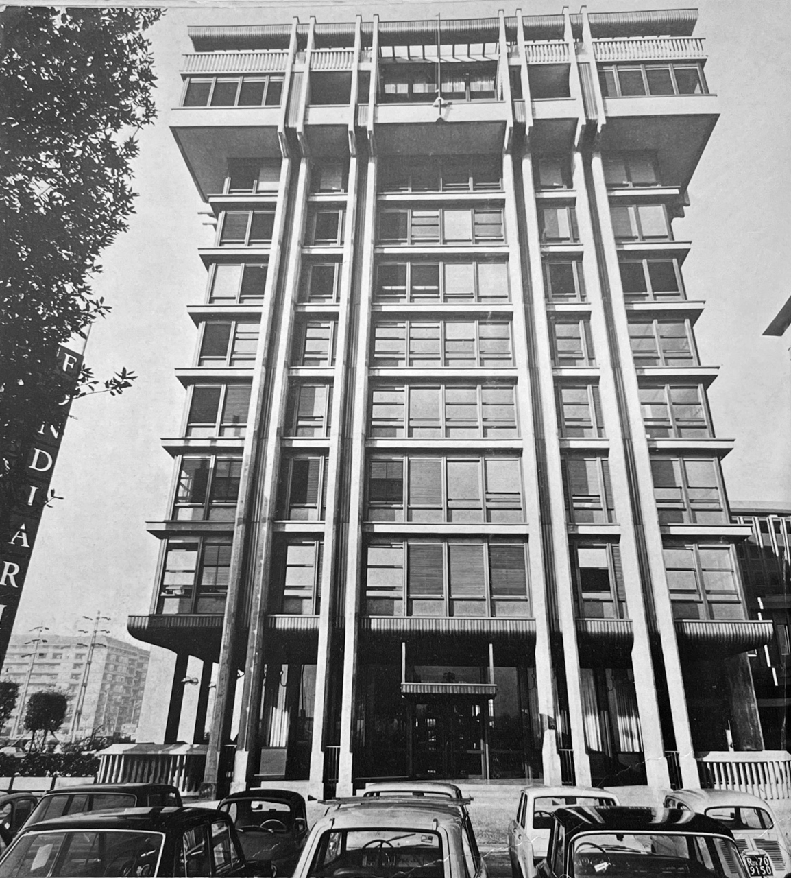 La struttura verticale in cemento armato è fortemente in aggetto rispetto al filo della facciata, sia per liberare di ingombri gli spazi interni, sia per creare il “tema architettonico” fondamentale dell’edificio. Le facciate sono risolte con infissi che con le loro parti trasparenti e opache occupano tutto lo spazio risultante tra i pilastri e i piani dei solai. Questi ultimi formano un contrappunto orizzontale nel tema di facciata. Lo spazio di 50 cm tra i pilastri binati è utilizzato per il passaggio delle canalizzazioni verticali. Intorno agli anni 2015 l’edificio è stato completamente ristrutturato e le facciate integrate con nuovi elementi.
