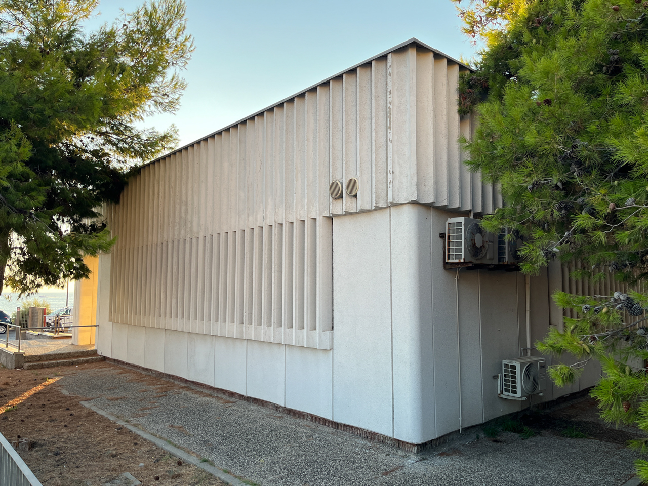 La struttura è costituita di pilastri e travi di calcestruzzo armato. I solai sono composti da coppelle nervate di calcestruzzo solidarizzate in opera. Le pareti esterne sono costituite di pannelli di cemento collegati alla fondazione e alla copertura. I pannelli, larghi 120 cm e alti 5,55 metri, sono a base di un impasto di cemento bianco, pigmenti coloranti e inerti di pietra naturale. Le pareti interne sono composte di un telaio metallico tamponato da lastre di fibrocemento.