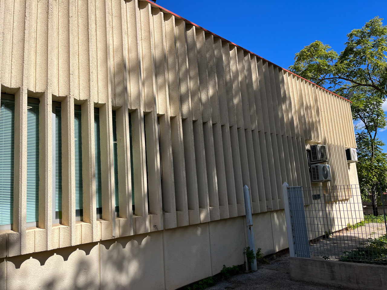 La struttura è costituita di pilastri e travi di calcestruzzo armato. I solai sono composti da coppelle nervate di calcestruzzo solidarizzate in opera. Le pareti esterne sono costituite di pannelli di cemento collegati alla fondazione e alla copertura. I pannelli, larghi 120 cm e alti 5,55 metri, sono a base di un impasto di cemento bianco, pigmenti coloranti e inerti di pietra naturale. Le pareti interne sono composte di un telaio metallico tamponato da lastre di fibrocemento.