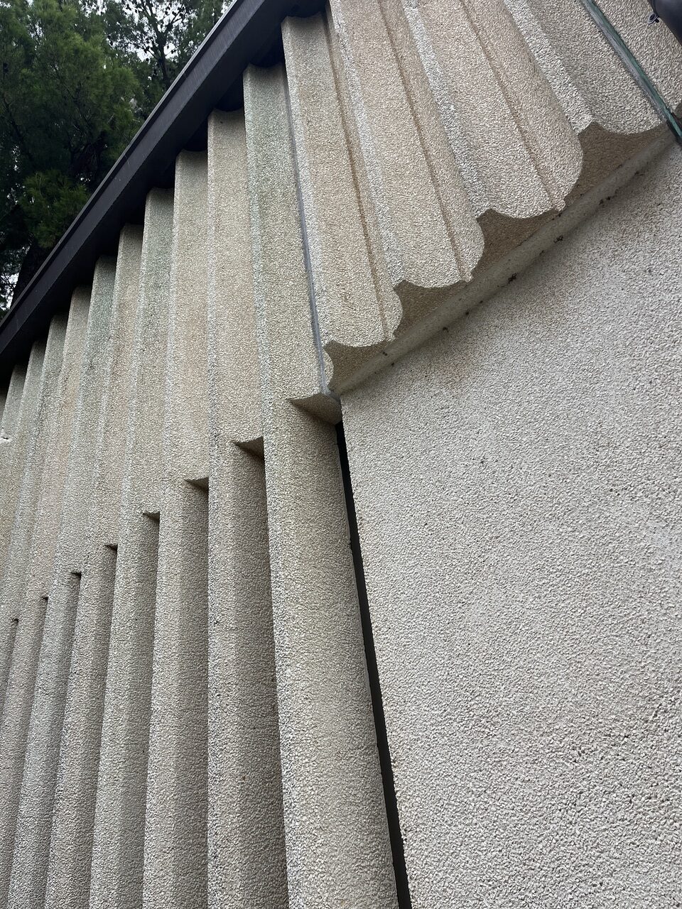 La struttura è costituita di pilastri e travi di calcestruzzo armato. I solai sono composti da coppelle nervate di calcestruzzo solidarizzate in opera. Le pareti esterne sono costituite di pannelli di cemento collegati alla fondazione e alla copertura. I pannelli, larghi 120 cm e alti 5,55 metri, sono a base di un impasto di cemento bianco, pigmenti coloranti e inerti di pietra naturale. Le pareti interne sono composte di un telaio di acciaio zincato con lastre di petralit.