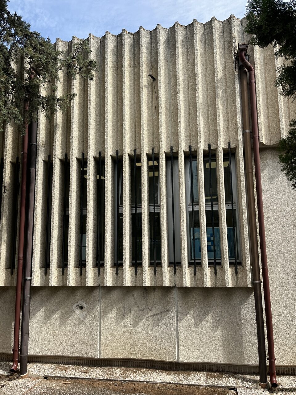 La struttura è costituita di pilastri e travi di calcestruzzo armato. I solai sono composti da coppelle nervate di calcestruzzo solidarizzate in opera. Le pareti esterne sono costituite di pannelli di cemento collegati alla fondazione e alla copertura. I pannelli, larghi 120 cm e alti 5,55 metri, sono a base di un impasto di cemento bianco, pigmenti coloranti e inerti di pietra naturale. Le pareti interne sono composte di un telaio metallico tamponato da lastre di fibrocemento.
