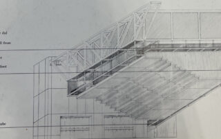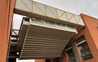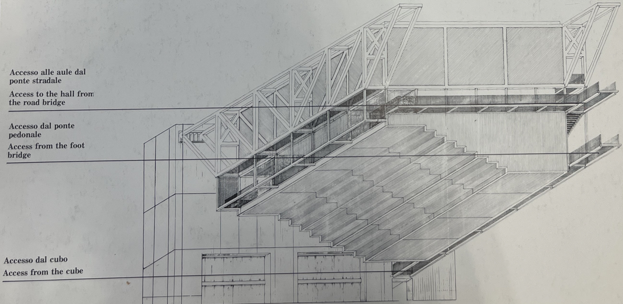 La struttura di acciaio è costituita da una coppia di travi reticolari principali a doppia parete e da due travi reticolari a parete poste trasversalmente alle prime. Le pareti esterne sono realizzate con pannelli di lamiera grecata coibentata. Le travi principali sono appoggiate sulle pareti di calcestruzzo armato degli edifici attigui. Le superfici vetrate presenti sul fronte ovest e lungo la galleria della biblioteca sono composte di lastre di vetro temperato fissate ai montanti di acciaio.